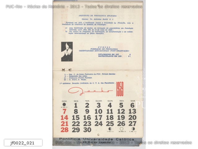 Mês de Junho no Calendário da PUC-Rio referente ao ano de 1959. Contém informações sobre o Instituto de Psicologia Aplicada. |