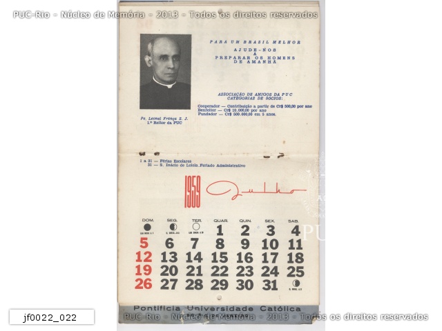 Mês de Julho no Calendário da PUC-Rio referente ao ano de 1959. Contém nota sobre contribuições da Associação dos Amigos da PUC. Foto do Pe. Franca S.J.. |