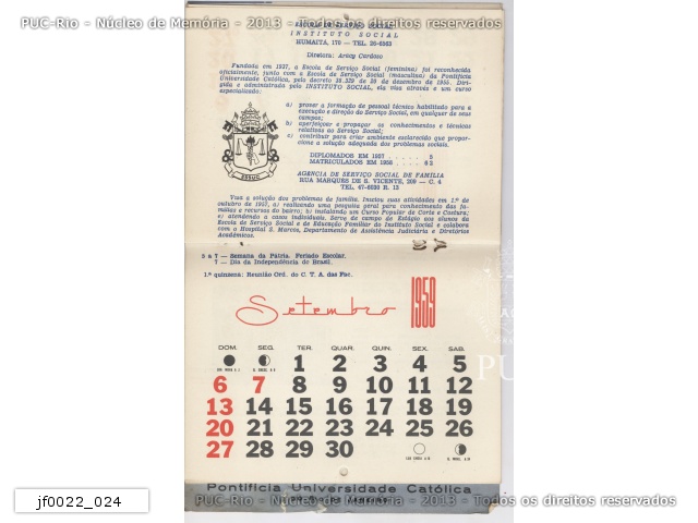 Mês de Setembro no Calendário da PUC-Rio referente ao ano de 1959. Contém informações sobre a Escola de Serviço Social (Instituto Social) e da Agência de Serviço Social da Família. |