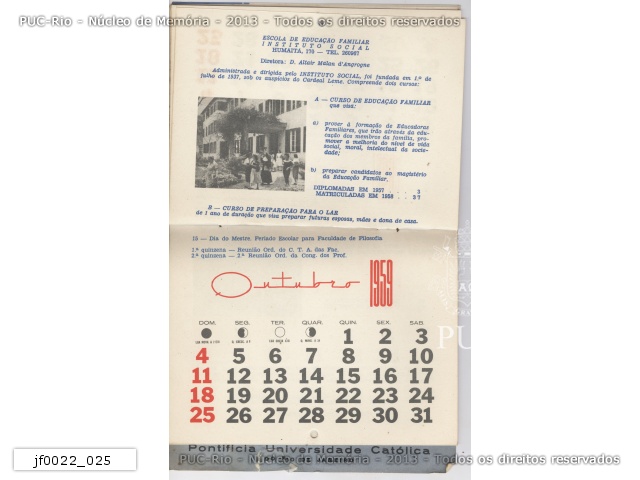 Mês de Outubro no Calendário da PUC-Rio referente ao ano de 1959. Contém informações sobre a Escola de Educação Familiar, localizada no Humaitá. Foto de alunas em frente ao prédio. |