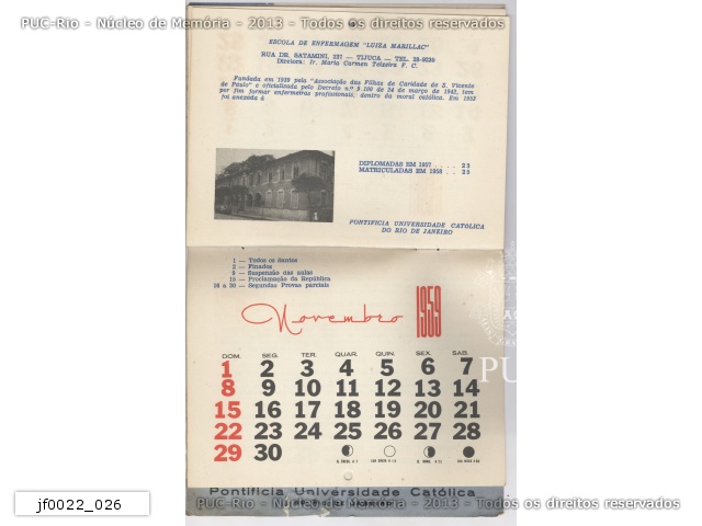 Mês de Novembro no Calendário da PUC-Rio referente ao ano de 1959. Contém informações sobre a Escola de Enfermagem Luiza Marillac, localizada na Tijuca, e que fazia parte da PUC-Rio. Foto da fachada do prédio. |