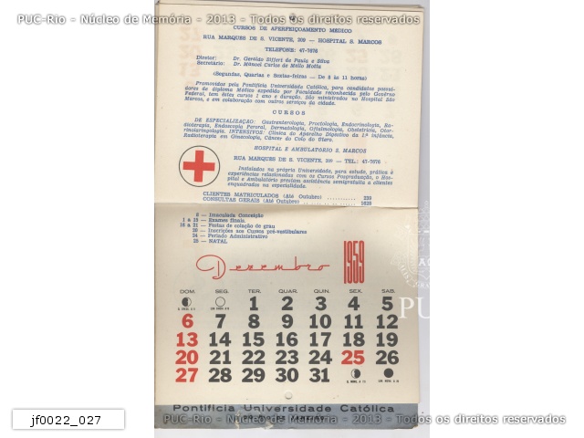 Mês de Dezembro no Calendário da PUC-Rio referente ao ano de 1959. Contém informações sobre o Curso de Aperfeiçoamento Médico. |