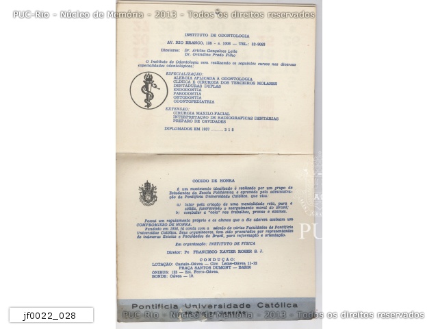 Calendário da PUC-Rio referente ao ano de 1959. Contém informações sobre o Instituto de Odontologia e o Código de Honra da Escola Politécnica. |