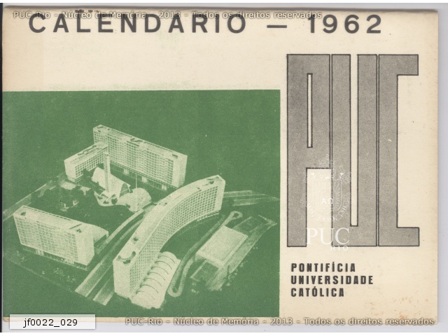 Capa do calendário da PUC-Rio referente ao ano de 1962. Contém imagem da maquete (projetada) do campus Gávea. |
