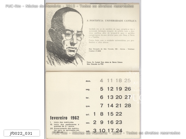 Calendário da PUC-Rio referente ao mês de Fevereiro do ano de 1962. Contém nota sobre a fundação da Universidade e imagem do Grão-Chanceler da PUC-Rio, dom Jaime de Barros Câmara. |