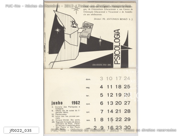 Calendário da PUC-Rio referente ao mês de Junho do ano de 1962. Contém informações sobre o Instituto de Psicologia. Ilustração com espírito lendo o livro "De Anima". |