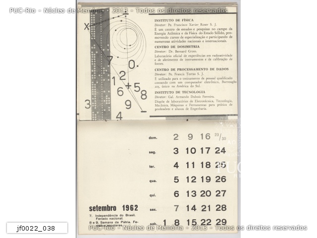 Calendário da PUC-Rio referente ao mês de Setembro do ano de 1962. Contém informações sobre o Instituto de Física, Centro de Dosimetria, Centro de Processamento de Dados, Instituto de Tecnologia. |