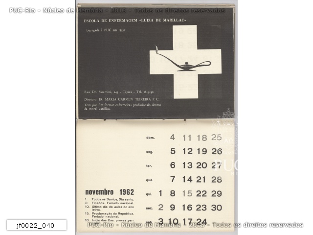 Calendário da PUC-Rio referente ao mês de Novembro do ano de 1962. Contém informações sobre a Escola de Enfermagem Luiza de Marillac, que já fez parte da PUC-Rio. |