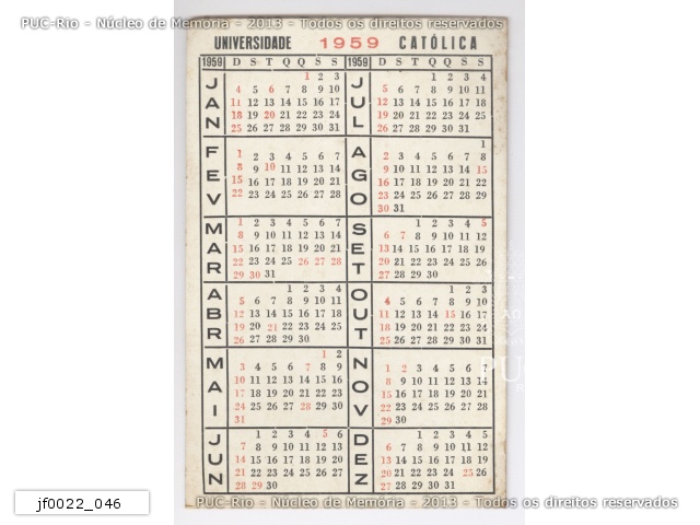 Calendário da Universidade Católica referente ao ano de 1959. |