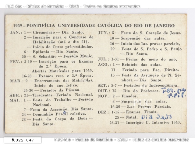Calendário acadêmico da Universidade Católica referente ao ano de 1959. |