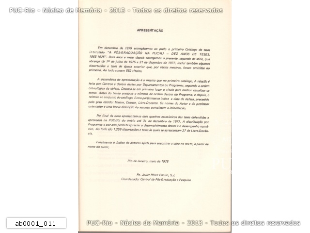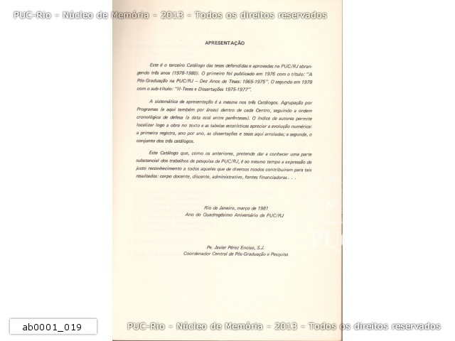 Apresentação do catálogo assinada pelo pe. Javier Pérez Enciso, S.J., coordenador da Central de Pós-Graduação e Pesquisa. |