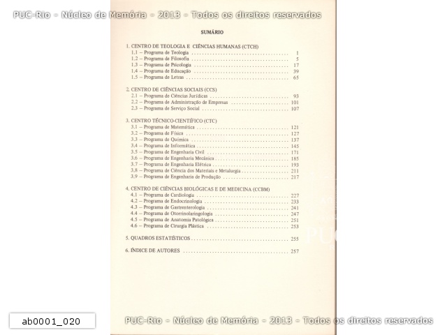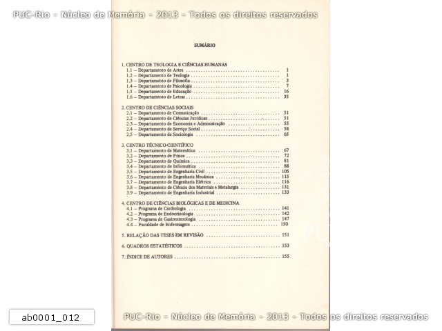 Sumário de A Pós-Graduação na PUC-RJ VII - Teses e Dissertações 1978-1980, dividido por programas de pós-graduação de cada centro acadêmico. |