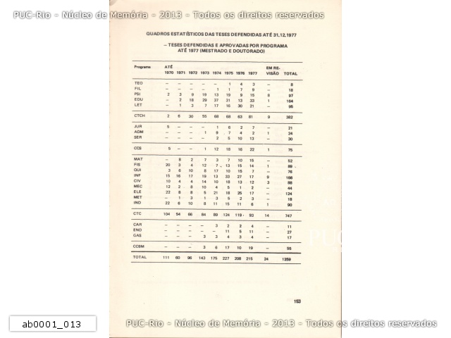 A Pós-Graduação na PUC/RJ II - Teses e Dissertações 1975-1977 - Quadro com o número de teses defendidas e aprovadas por programa de pós-graduação de 1970 até o ano de 1977. |