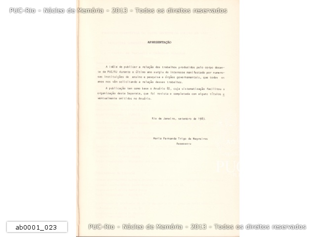 Apresentação de A Pós-Graduação na PUC/RJ VIII - Produção Científica do Corpo Docente - 1982, assinada pela assessora Maria Fernanda Trigo de Negreiros. |