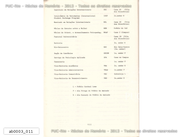 Localização e/ou sigla de órgãos e serviços da PUC-Rio no ano de 1991. |