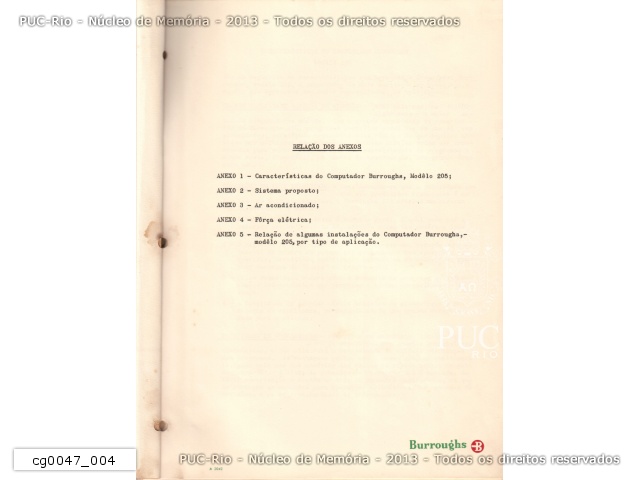 Listagem de anexos à proposta da Burroughs à PUC-Rio, endereçada ao Diretor da Escola Politécnica (Carlos Alberto del Castilho) sobre a venda de um computador modelo 205. |