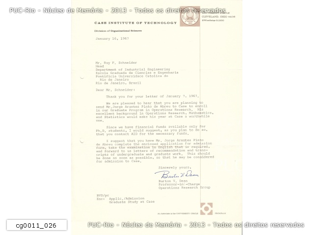 Correspondência do prof. Burton V. Dean (Case Institute of Technology) ao prof. Ruy Schneider (IND). Sobre o encaminhamento de um aluno para estudos no Case Institute. |