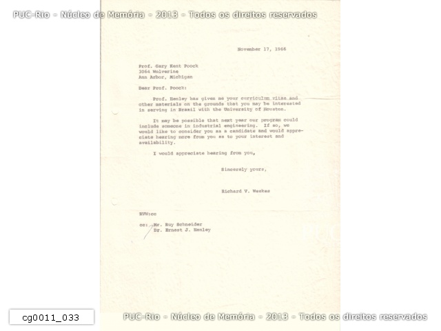 Correspondência do prof. Richard V. Weekes para o prof. Gary Kent Poock (Michigan University), com cópia para o prof. Ruy Schneider (IND) e para Ernst J. Henley. |