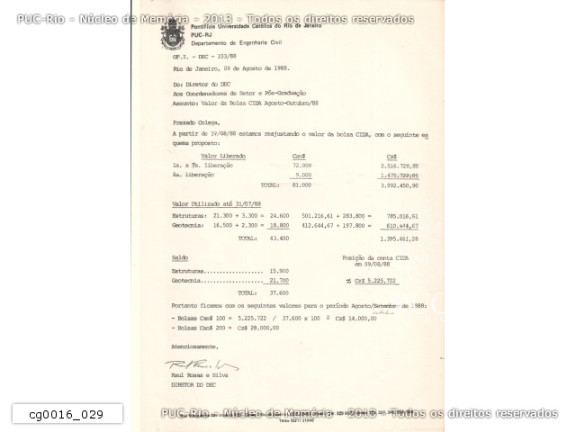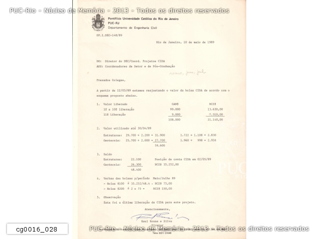 Correpondência do diretor para os coordenadores do Departamento de Engenharia Civil, contendo proposta de reajuste dos valores das bolsas CIDA. |