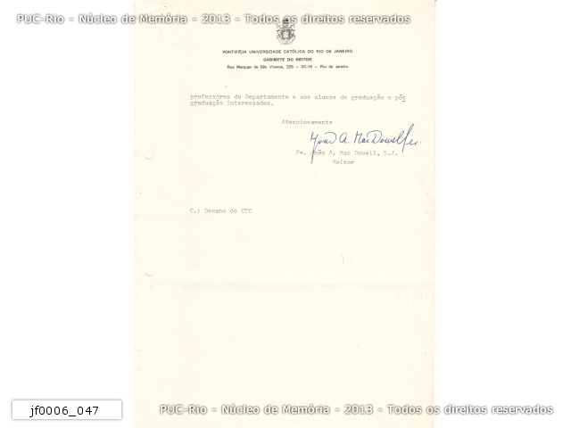Carta do Reitor pe. João A. Mac Dowell S.J. ao Departamento de Matemática, apontando alguns problemas da Pós-Graduação, Página 1. |