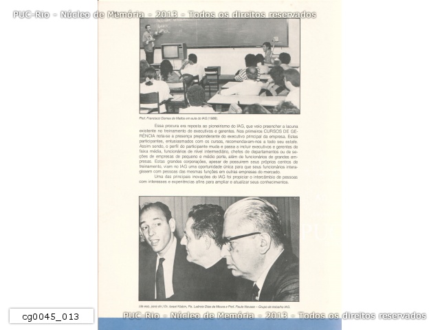 Fotos de uma sala de aula do IAG, 1988, e de grupo de trabalho do IAG, composto pelo pe. Laércio Dias Moura, S.J., engenheiro Israel Klabin e prof. Paulo Novaes. |
