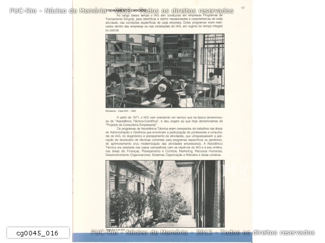 Explicação sobre os Programas de Treinamento Dirigido para empresas, Assistência Técnico-Científica e Projetos de Consultoria Empresarial. Foto da biblioteca na Casa IAG (1960) e das salas 6 e 7. |
