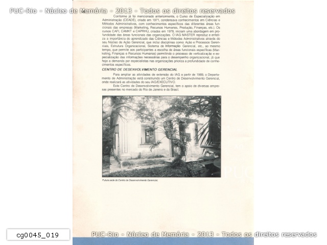A criação do IAG, com fotografias de solenidades, com a presença de autoridades da PUC-Rio. |