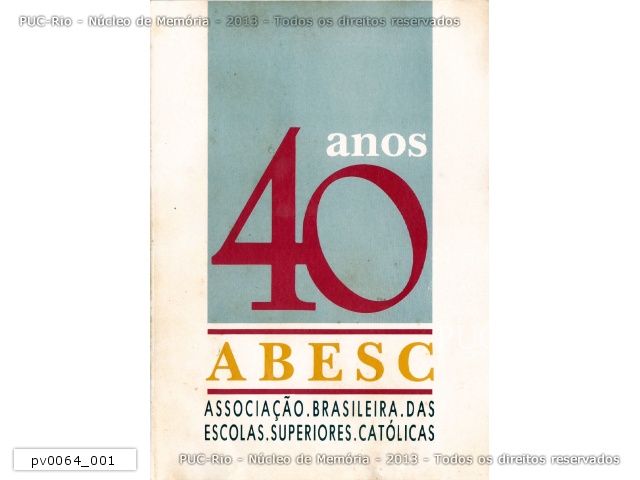 Capa da publicação 40 anos ABESC (Associação Brasileira das Escolas Superiores Católicas). Publicação em homenagem ao aniversário da ABESC. Suas páginas trazem informações sobre o histórico, as atividades, os componentes e os dirigentes da instituição. |