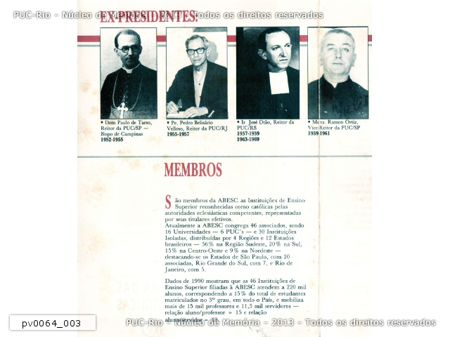 Ex-presidentes e membros da ABESC (Associação Brasileira de Escolas Superiores Católicas). O texto informa alguns dados relevantes do Ensino Superior no país, como o número de alunos, de professores e de servidores das instituições filiadas à ABESC. |
