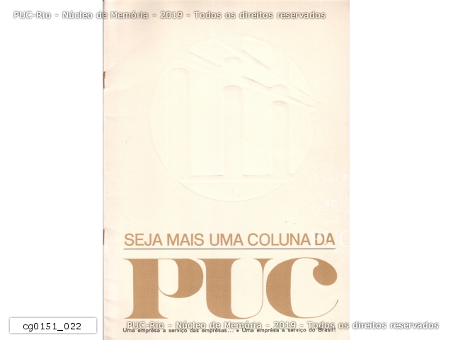 Capa do folder de divulgação da Campanha Financeira "Seja mais uma coluna da PUC". "Uma empresa a serviço das empresas... E uma empresa a serviço do Brasil." |