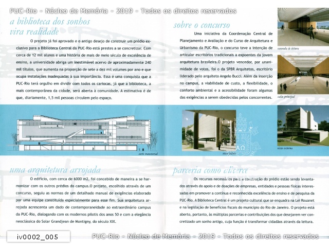 Folder de divulgação do projeto de construção do novo espaço para a Divisão de Bibliotecas e Documentação da PUC-Rio. Diz o texto que a "biblioteca dos sonhos vira realidade", e que o projeto vencedor do concurso promete "arquitetura arrojada". |