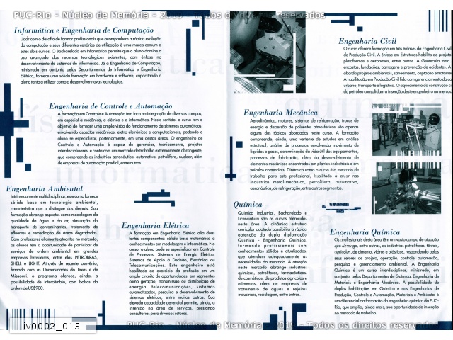 Capa do folheto de divulgação dos cursos do Centro Técnico Científico (CTC). Lista e endereços dos cursos. Engenharia Civil, Arquitetura e Urbanismo, Engenharia de Materiais, Computação, Informática, Física, Química, Engenharia Química, Mecânica, Petróleo, Matemática, Controle e Automação, Elétrica e Produção. Imagem estilizada do Edifício Cardeal Leme. |