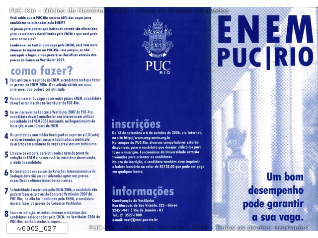 Divulgação de informações sobre o ENEM, que começava a ser utilizado pelas universidades como forma de acesso alternativa aos vestibulares. A PUC-Rio, neste momento, reservava 60% de suas vagas aos candidatos via ENEM. O candidato, ao se inscrever para o vestibular da PUC-Rio, indicava se queria utilizar sua nota do ENEM para a seleção na Universidade. Caso conseguisse classificação com a nota do ENEM, não precisava fazer o vestibular. |