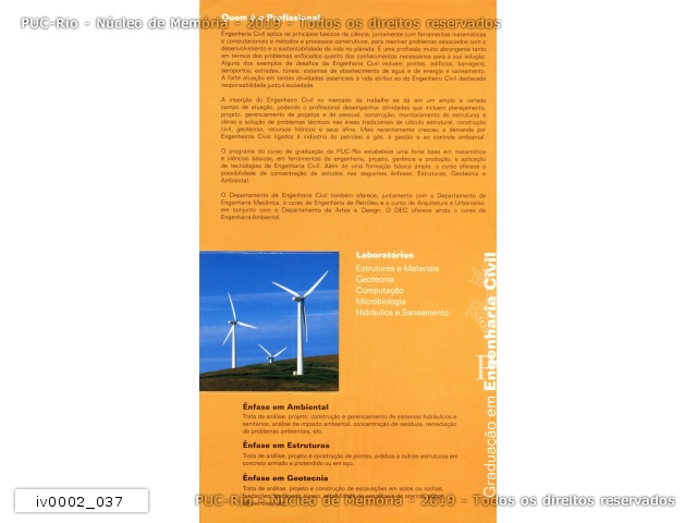 Apresentação da graduação em Engenharia Civil. "Quem é o profissional" e lista dos laboratórios. Foto de geradores de energia eólica. |