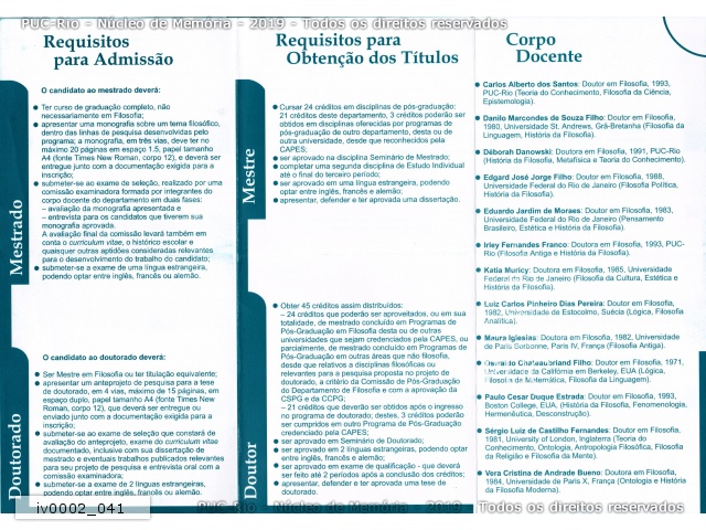 Apresentação da Pós-graduação em Filosofia. Requisitos para admissão, Requisitos para obtenção dos títulos, Corpo docente. |