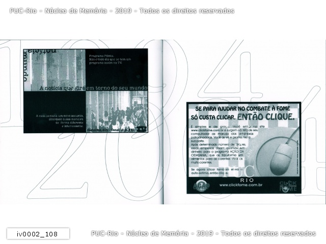 Folder sobre o Núcleo de Criação do Projeto Comunicar. Campanhas produzidas ao longo dos anos. TV PUC e Click Fome. |
