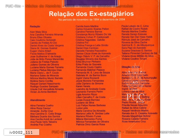 Folder sobre o Núcleo de Criação do Projeto Comunicar. Campanhas produzidas ao longo dos anos. Relação dos ex-estagiários de 1994 a 2004. |