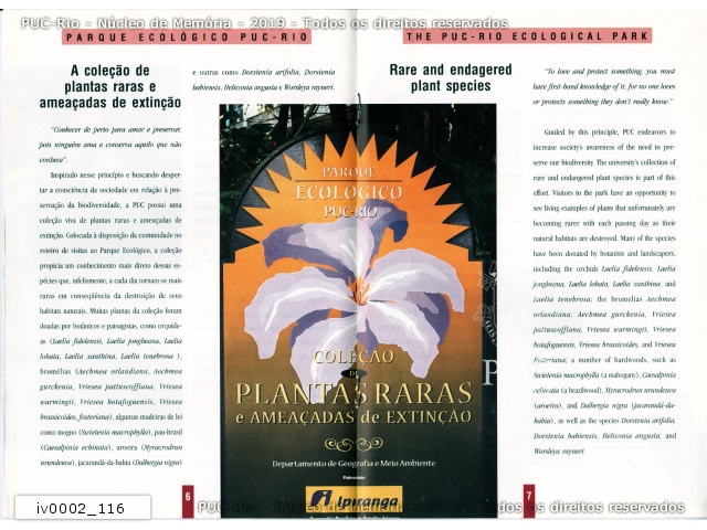 Parque Ecológico da PUC-Rio - Guia de visitantes. Bilíngue. A coleção de plantas raras e ameaçadas de extinção. Ilustração. |