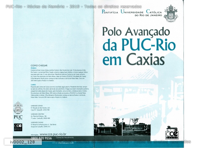 Folheto de divulgação das atividades do Polo Avançado da PUC-Rio em Duque de Caxias. Como chegar. Fotos do polo. Endereços. |