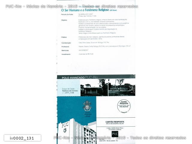 Folheto de divulgação das atividades do Polo Avançado da PUC-Rio em Duque de Caxias. Curso oferecido pelo Departamento de Teologia. |