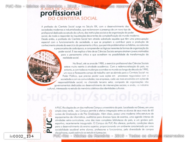 Apresentação do Departamento de Sociologia e Política, que estaria completando 50 do Curso de Sociologia. Área de atuação profissional do cientista social. O campus da PUC-Rio. |
