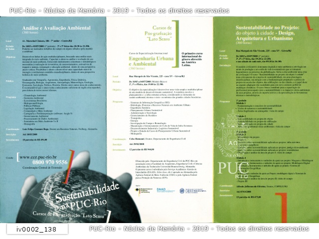 Apresentação de cursos sobre sustentabilidade oferecidos pela Coordenação Central de Extensão. Cursos de pós-graduação Lato Sensu. Análise e avaliação ambiental, Engenharia Urbana e Ambiental, Sustentabilidade no Projeto: do objeto à cidade - Design, arquitetura e urbanismo. |