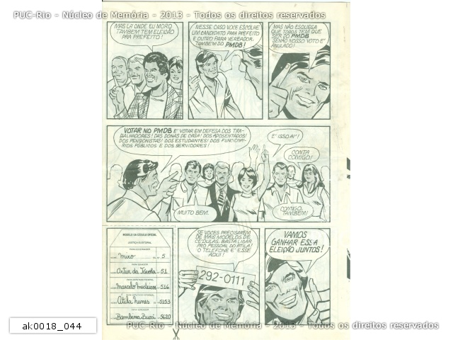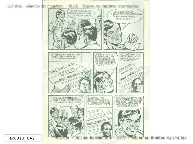 Página 01. Panfleto com quadrinhos sobre a campanha eleitoral para governador e senador, para as eleições de 1982. São citados os candidatos Miro Teixeira (para governador), Artur da Távola (para senador) e Marcelo Medeiros (para deputado federal).. |