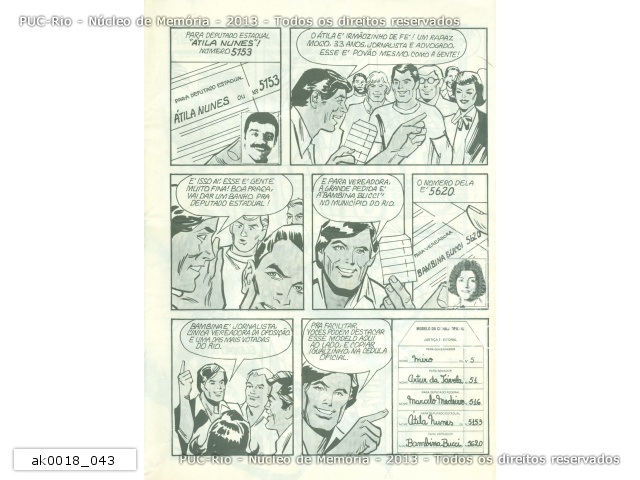 Página 02. Panfleto com quadrinhos sobre a campanha eleitoral para governador e senador, para as eleições de 1982. São citados os candidatos Miro Teixeira (para governador), Artur da Távola (para senador), Marcelo Medeiros (deputado federal), Átila Nunes (deputado estadual) e Bambina Bucci (para vereador). |
