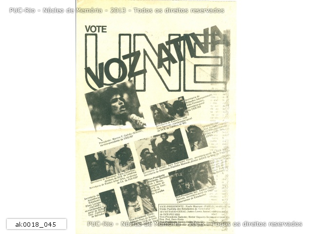 Capa. Folheto de propaganda da chapa Voz Ativa para as eleições da UNE. Fotos, identificadas, de alguns líderes, candidatos a cargos na UNE. |