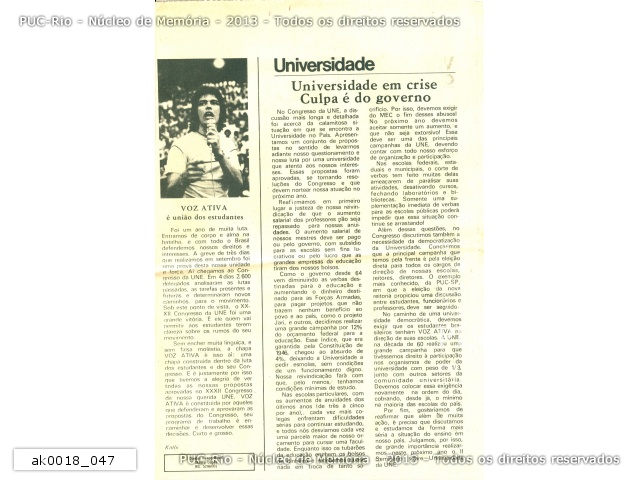 Folheto de propaganda da chapa Voz Ativa para as eleições da UNE. Artigo: "Universidade em crise - Culpa é do governo". |