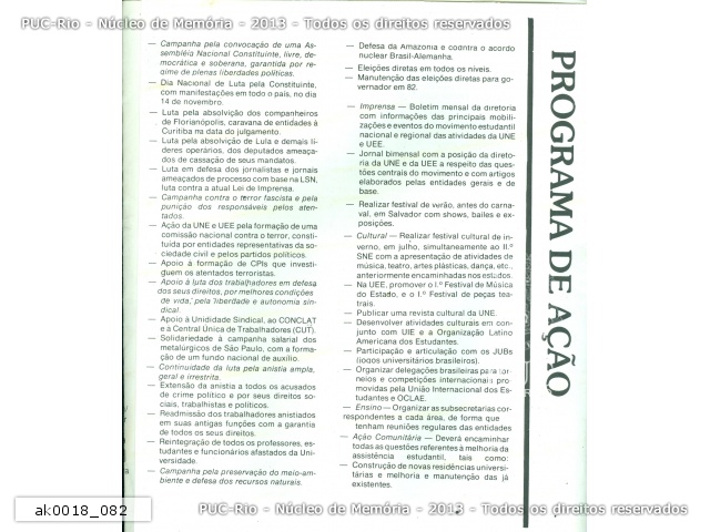Página 06. "Programa de Ação". Lista de propostas para a luta do movimento estudantil, desde a campanha por uma Assembleia Nacional Constituinte, a favor da imprensa livre, apoio aos trabalhadores, até a melhoria da moradia dos estudantes nas universidades. |
