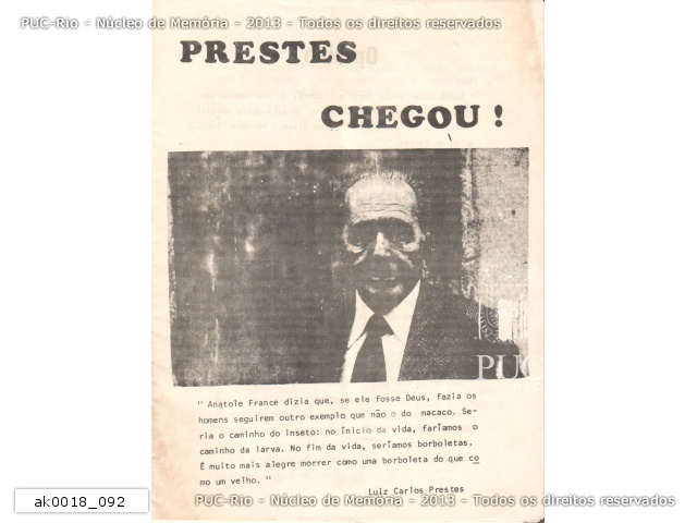 Capa. Panfleto sobre Luiz Carlos Prestes, possivelmente distribuído após a volta de Prestes ao Brasil, no final de 1979. Foto de Prestes. |