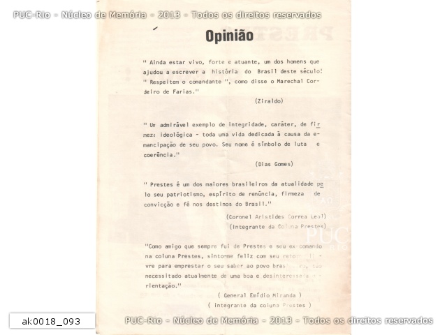 Opiniões sobre Prestes: Ziraldo, Dias Gomes, integrantes da Coluna Prestes. Panfleto possivelmente distribuído após a volta de Prestes ao Brasil, no final de 1979. |