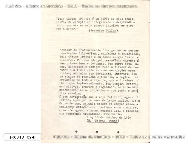 Opiniões sobre Prestes: Ferreira Goulart, Sobral Pinto. Panfleto sobre Luiz Carlos Prestes, possivelmente distribuído após a volta de Prestes ao Brasil, no final de 1979. |